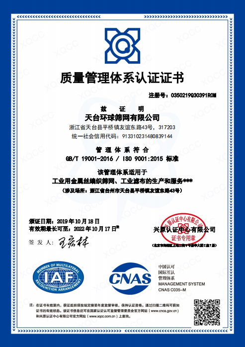 天臺環(huán)球篩網(wǎng)有限公司,成立于1995年,座落在東海之濱美麗的天臺山腳下,注冊資金500萬人民幣,公司已通過ISO9001:2015國際質(zhì)量體系認(rèn)證。經(jīng)過環(huán)球人的不斷努力,目前公司已擁有標(biāo)準(zhǔn)廠房10,000平方米,各種篩網(wǎng)設(shè)備近100臺,員工100余人,其中高中級科研及管理人員10人,公司產(chǎn)品主要有:不銹鋼網(wǎng),銅網(wǎng),電焊網(wǎng),電焊網(wǎng)片,軋花網(wǎng),不銹鋼延伸產(chǎn)品,單復(fù)絲濾布,濾布袋,壓濾機袋等。